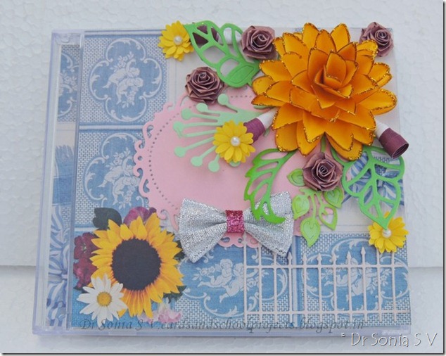 The CD case is a notebook holder similar to the teachers day gifts I had shared earlier[See link How to recycle CD cases].The silver bow is handmade with silver ribbon and a pink glitter paper strip.The purple roses are quilled roses and the tiny yellow daisies are punchcraft flowers.The big yellow flower is relatively easy to put together and is made of just 6 flowers.